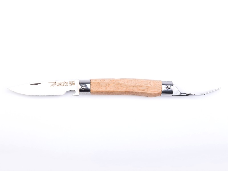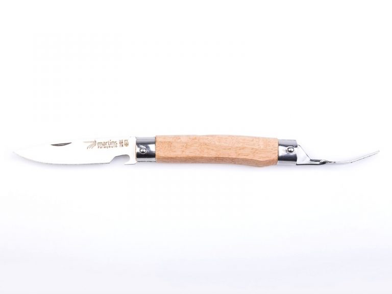 Traditional knife, of agricultural origin, with stainless steel blade [420] and articulated fork. Wooden handle.